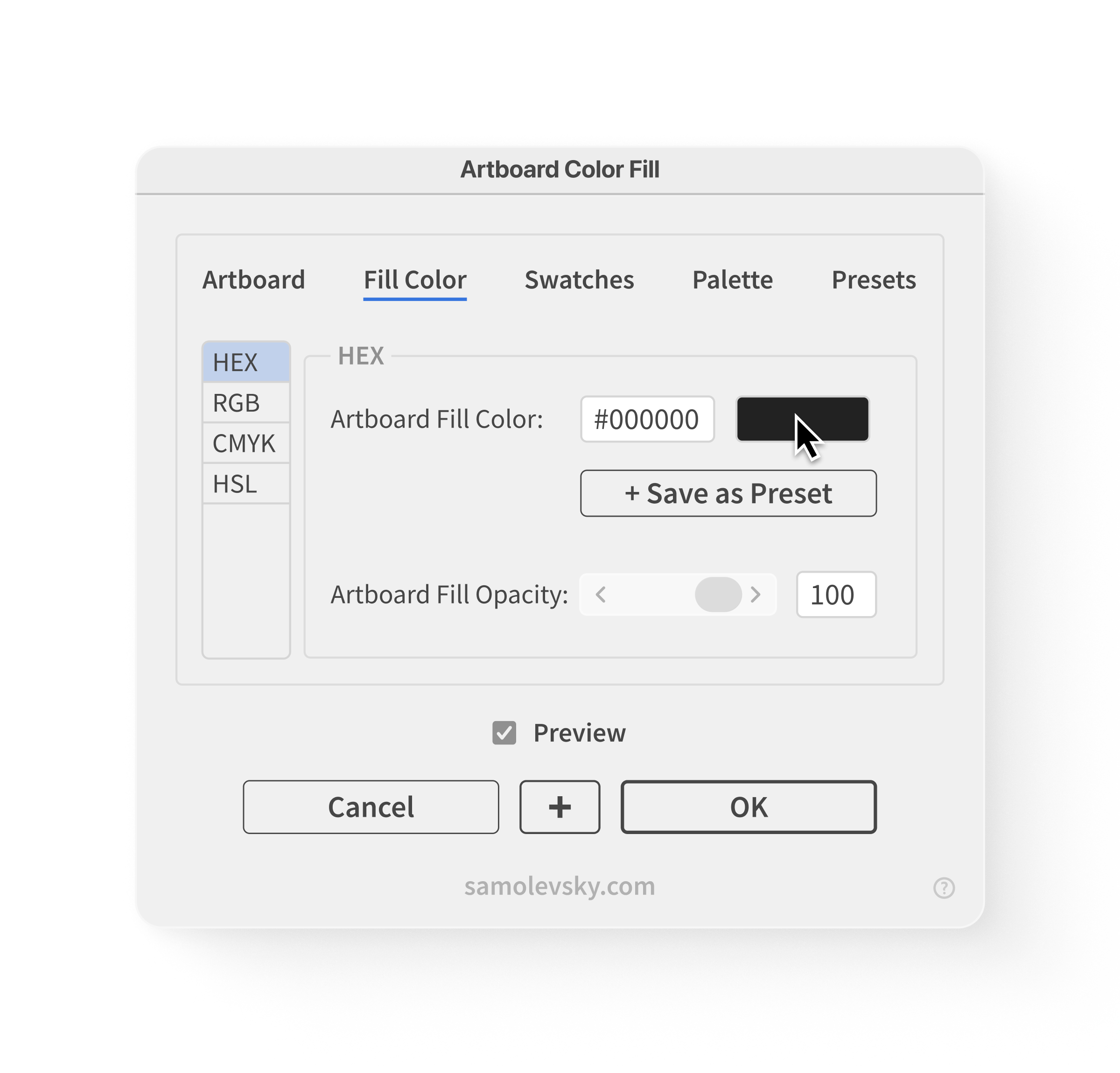 - Saving a Preset: In the Fill Color > HEX tab, click the + Save as Preset button to save your current color.