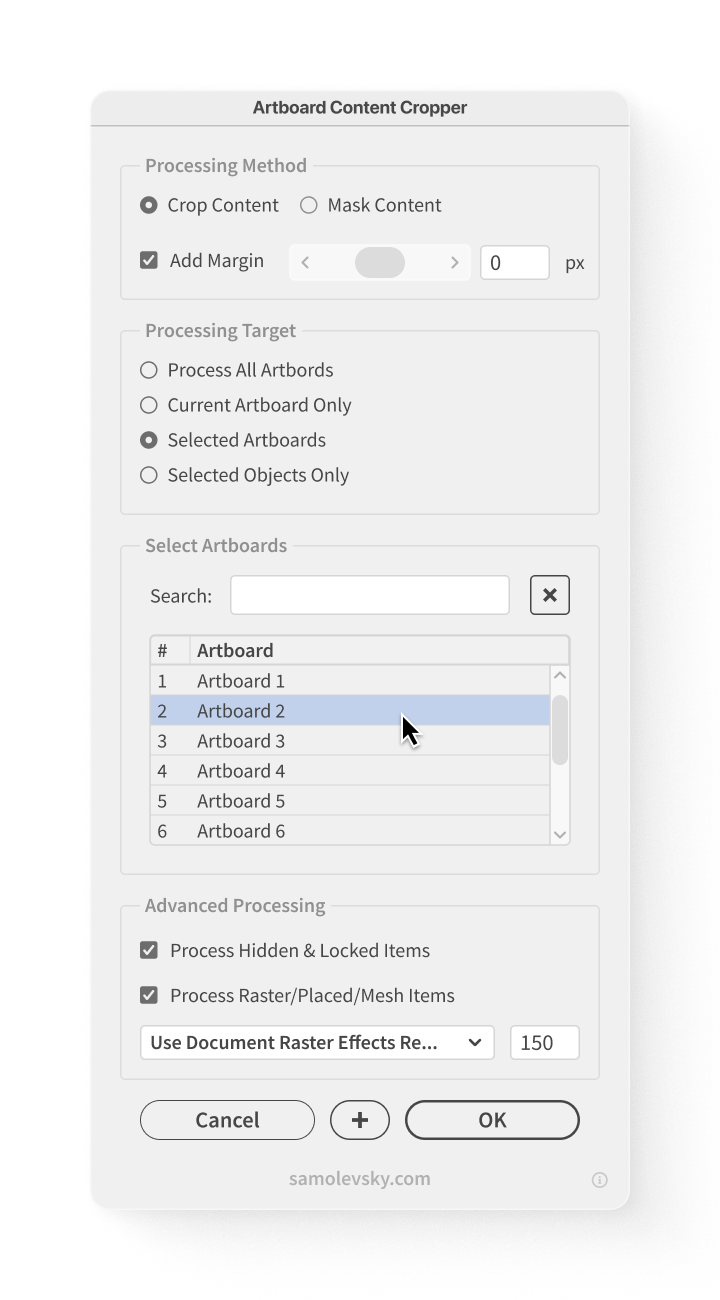 - Flexible Target Selection: Process all artboards, current artboard, selected artboards, or selected objects only