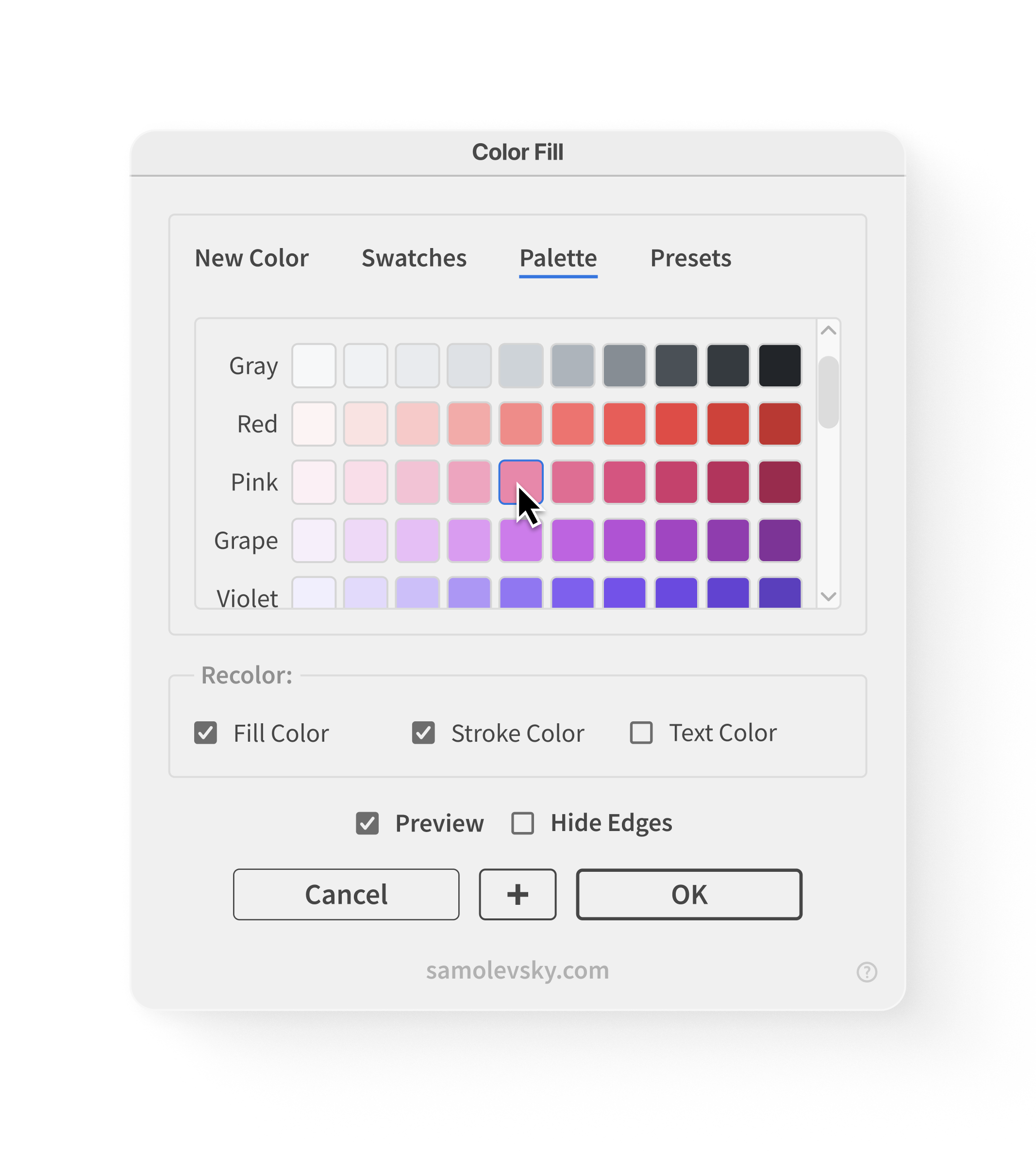 - The dialog is organized into four main tabs: New Color, Swatches, Palette, and Presets.
