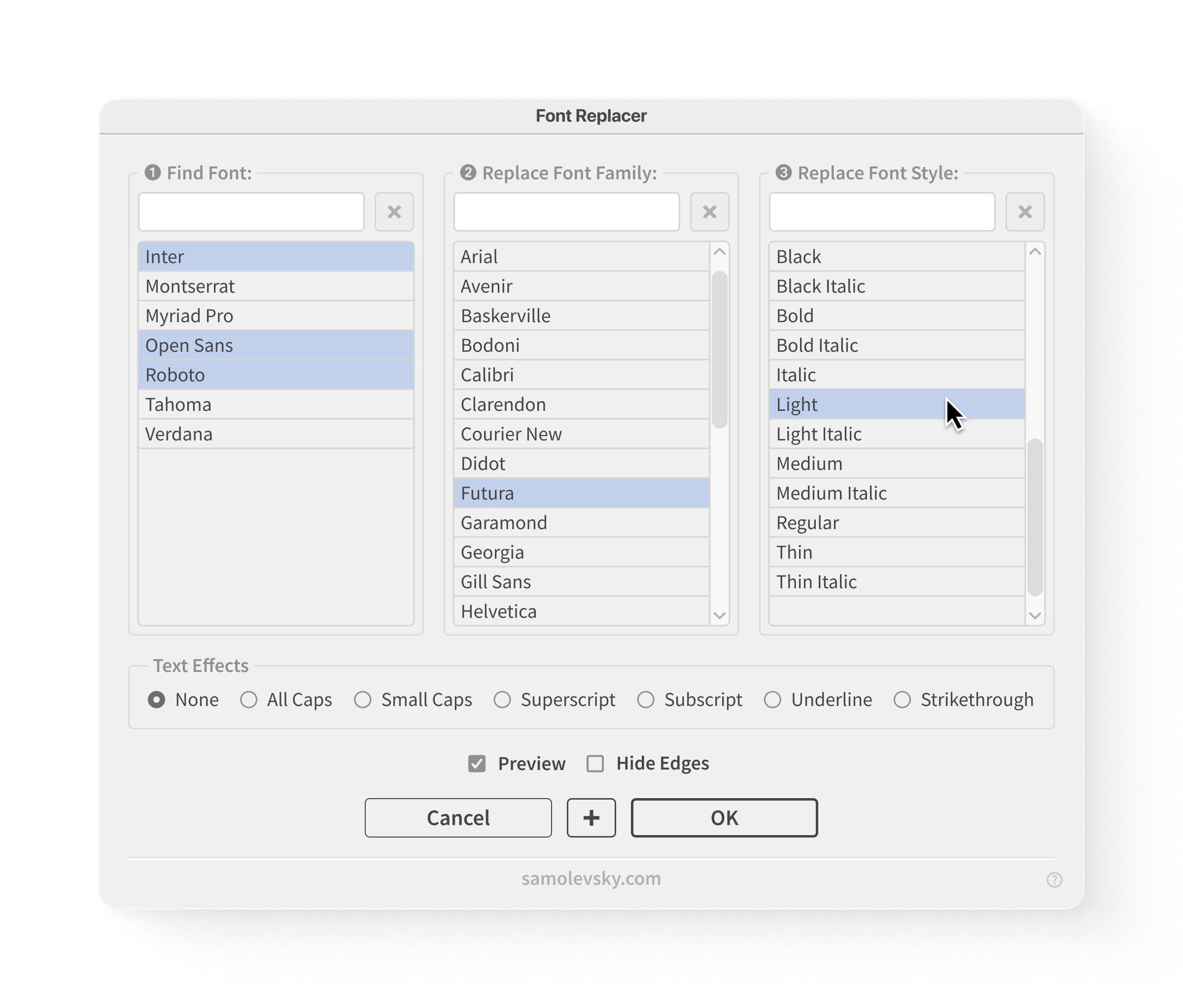 - Advanced Text Effects: Apply styling options like All Caps, Small Caps, Superscript, Subscript, Underline, and Strikethrough while replacing fonts.