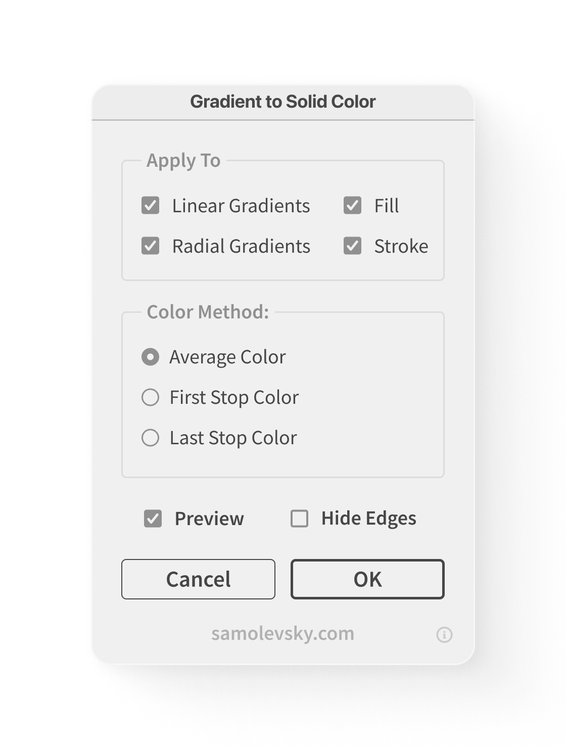 The Gradient to Solid Color script streamlines the conversion of complex gradients into solid colors, offering designers precise control over the conversion process through multiple color extraction methods and selective processing options.