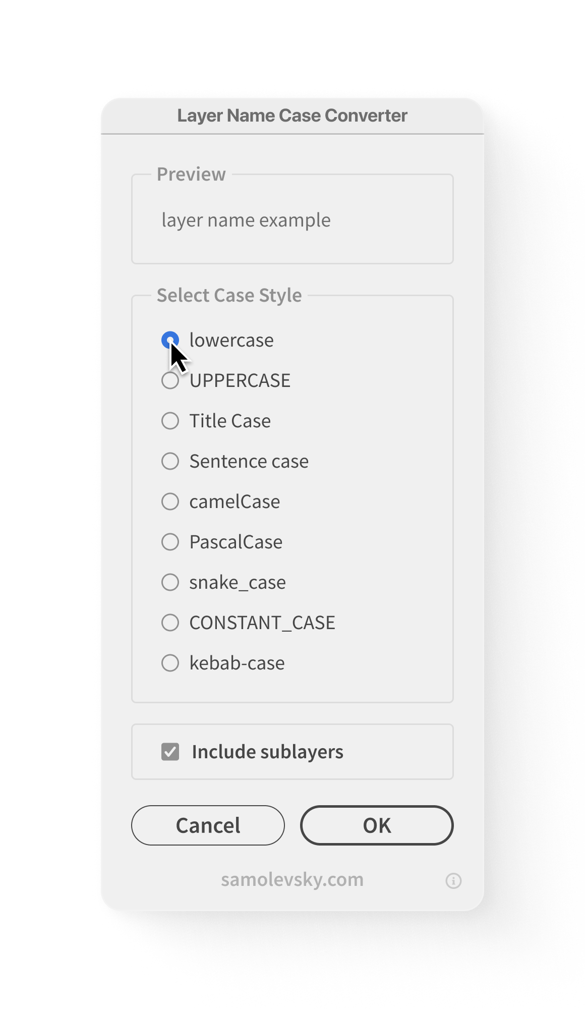1. Preview Section: Shows how a sample layer name will appear with the selected case style.