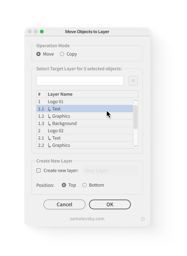 The Move Objects to Layer script is a powerful Adobe Illustrator automation tool that streamlines the process of organizing artwork by moving or copying selected objects between layers. This script provides an intuitive interface for managing layer organization with advanced features like search filtering, hierarchical layer display, and the ability to create new layers on-the-fly.