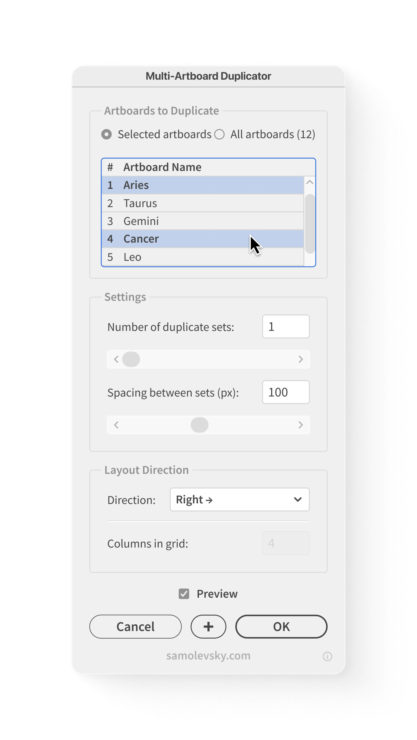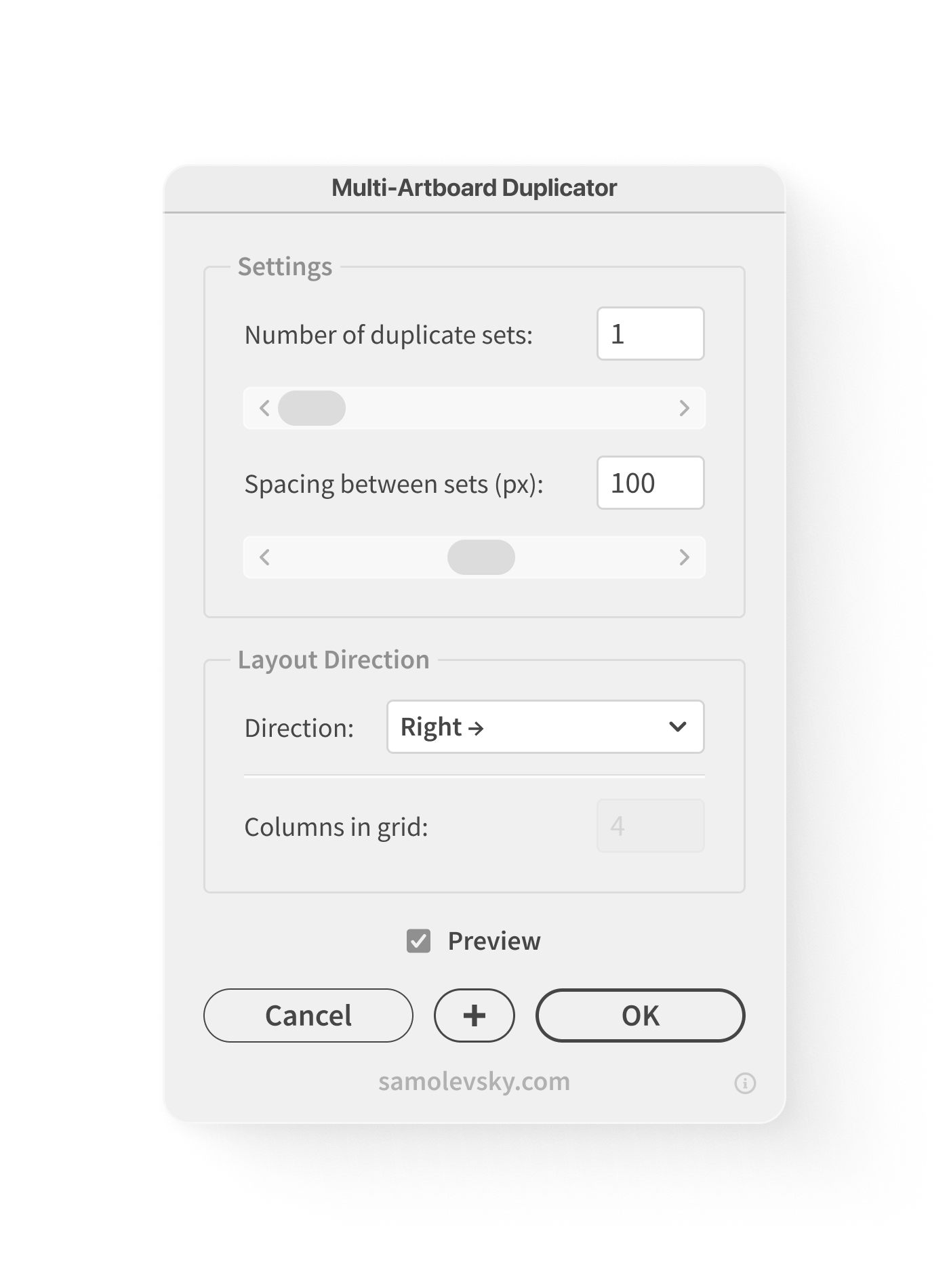 By offering intuitive controls for spacing, direction, and layout, along with the valuable preview function, the script enables you to visualize your duplicates before committing to changes. This makes it particularly useful for complex projects requiring multiple artboard iterations.