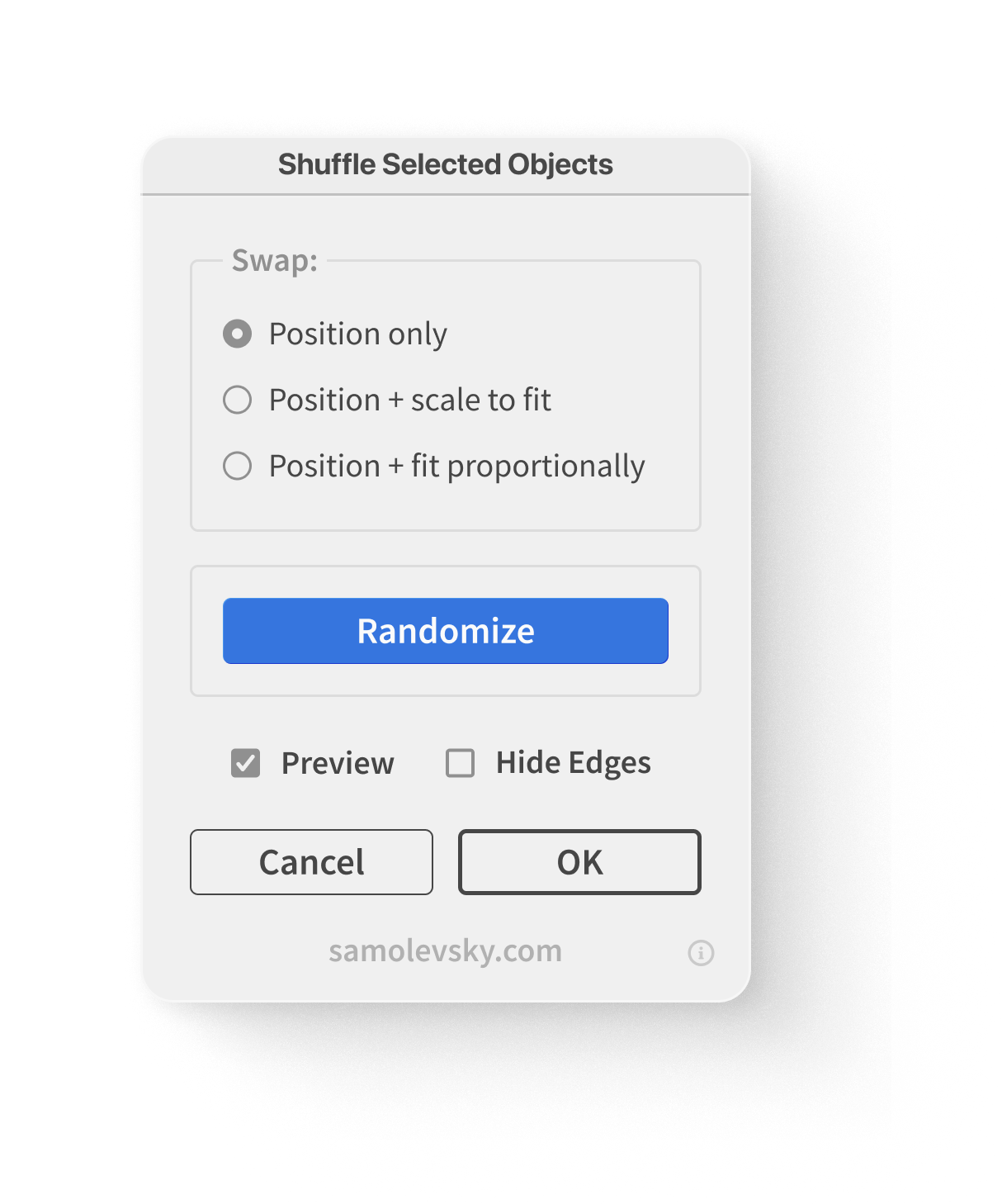 The Shuffle Selected Objects script is a powerful Adobe Illustrator automation tool that randomly rearranges the positions of selected objects on your artboard. This script is perfect for designers who want to quickly create random layouts, explore different arrangements, or add organic unpredictability to their designs.
