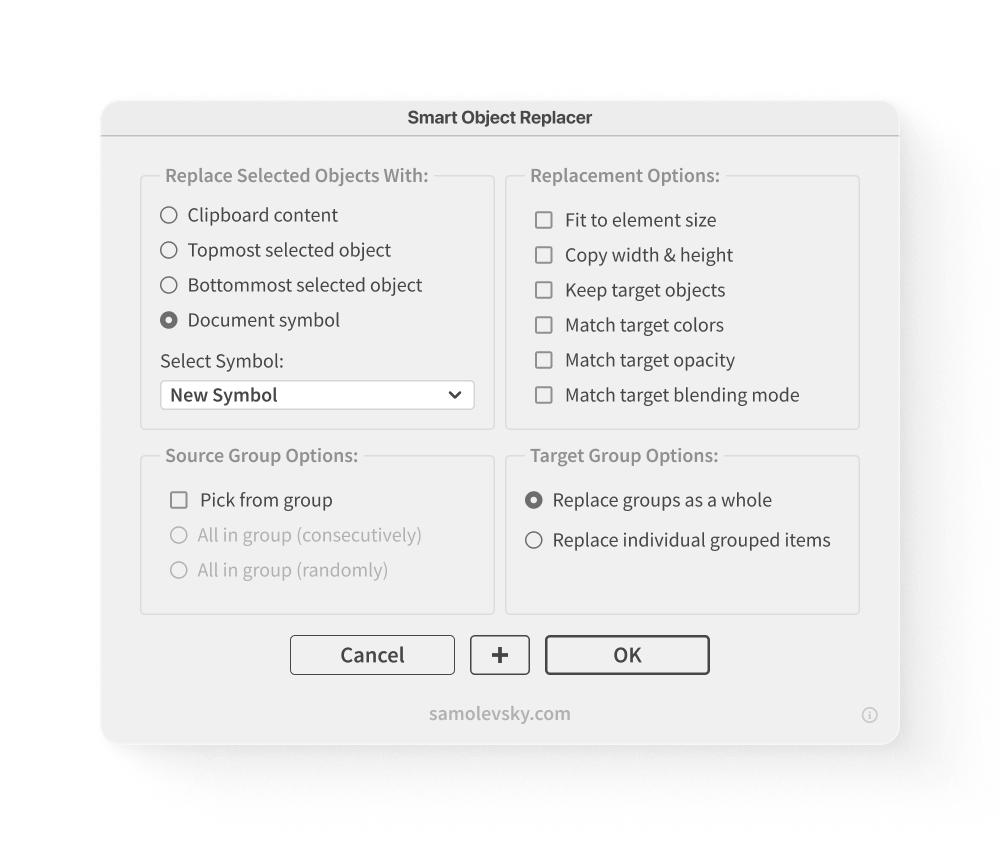Smart Object Replacer is a powerful Adobe Illustrator script that streamlines the process of replacing multiple selected objects with a source object. Whether you need to replace objects with clipboard content, use an existing object from your selection, or apply a document symbol across multiple targets, this script provides flexible options to automate repetitive replacement tasks.