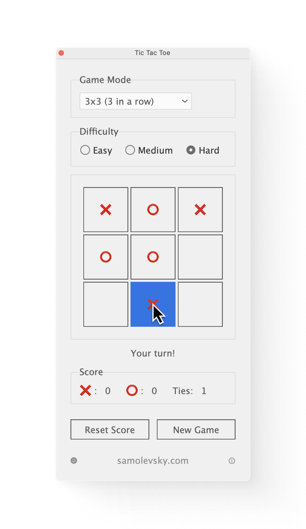 - Hard: AI always makes the optimal move using advanced algorithms.