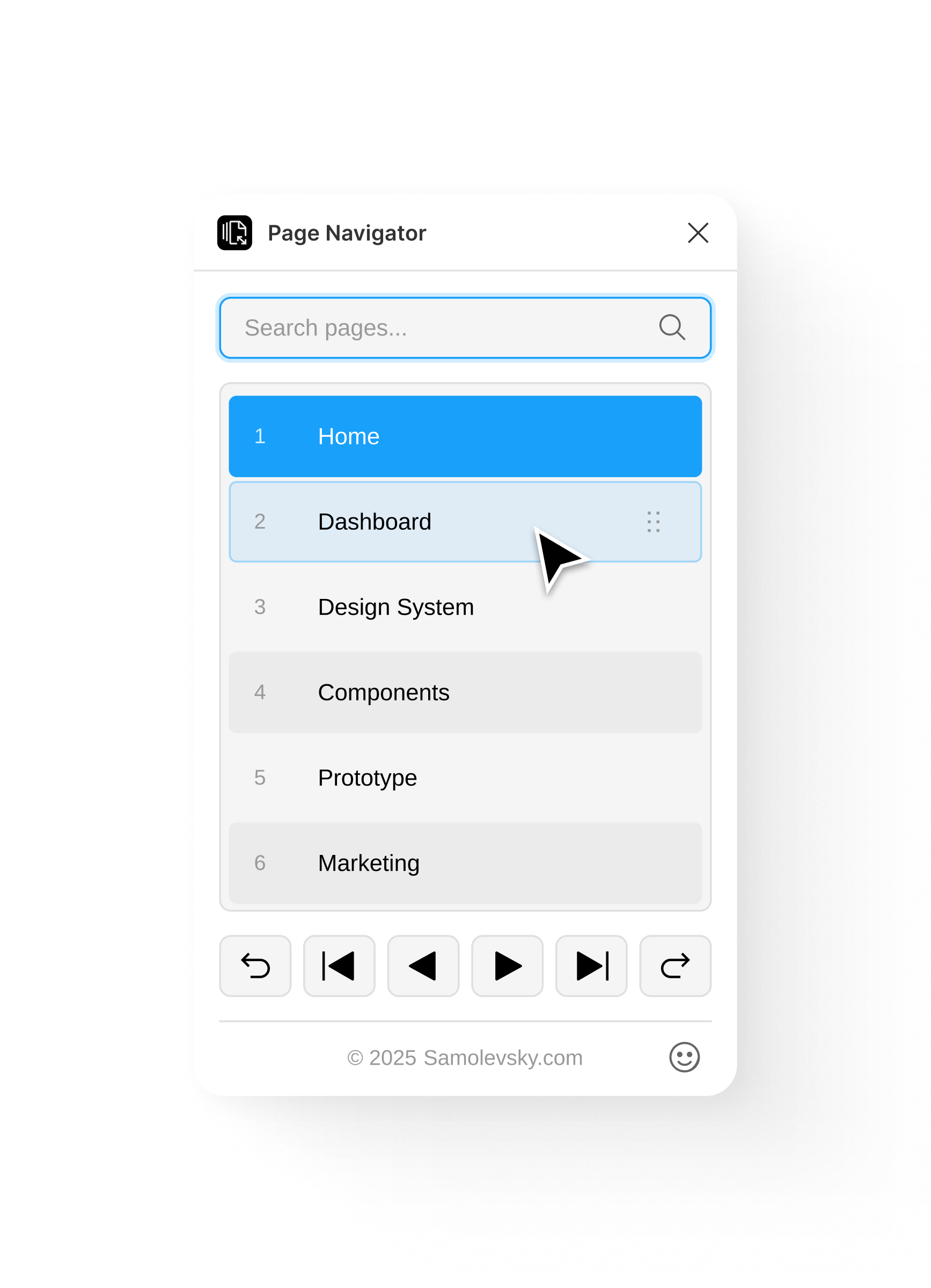 Page Navigator lets you search and jump between pages in your Figma file instantly. It adds fast navigation controls, keyboard shortcuts, inline page renaming, quick page creation, drag-and-drop reordering, and a simple, user-friendly UI.