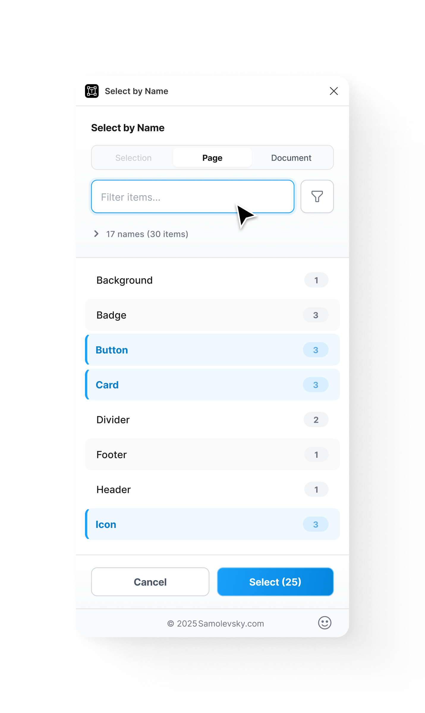 Select by Name streamlines your Figma workflow by making it easy to find, filter, and select elements across complex designs.