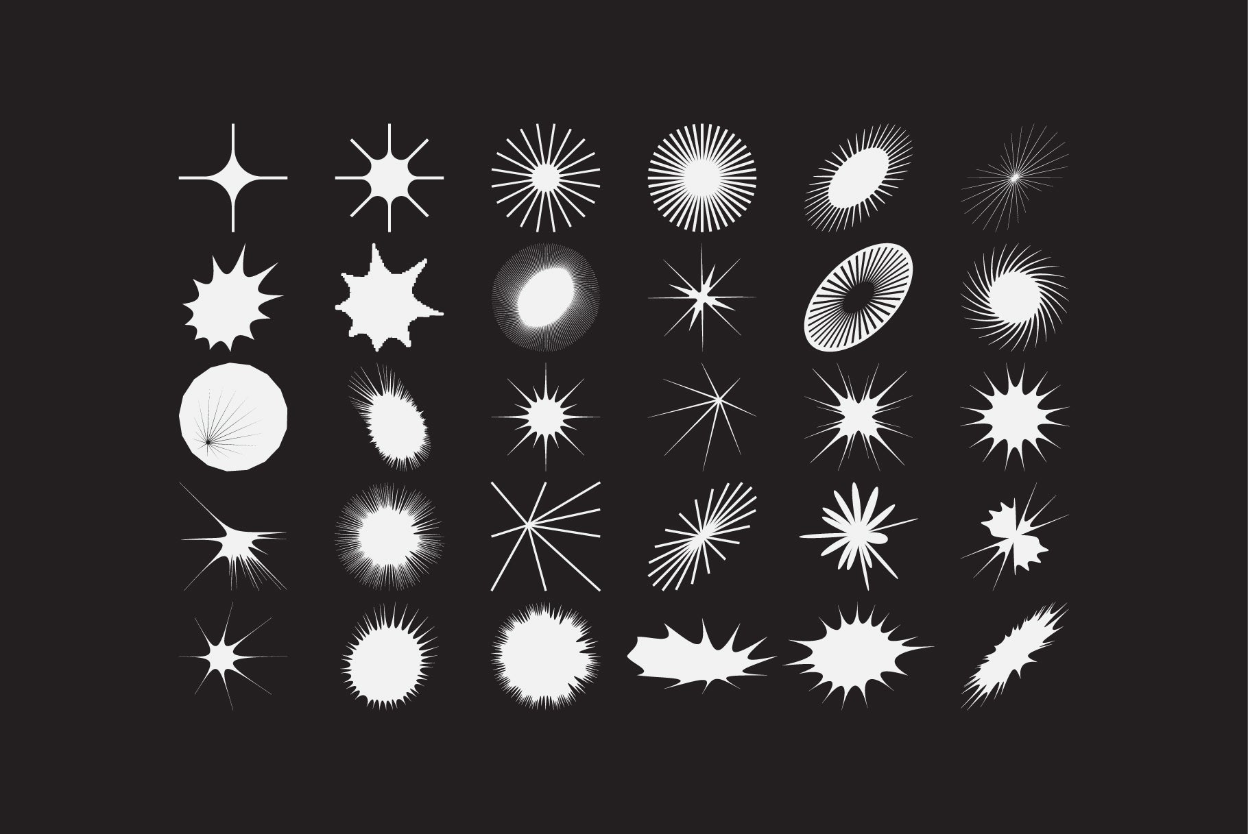 This huge and diverse selection features over 100 vector star-shaped design elements, ranging from simple symmetrical shapes to distorted and surreal forms.