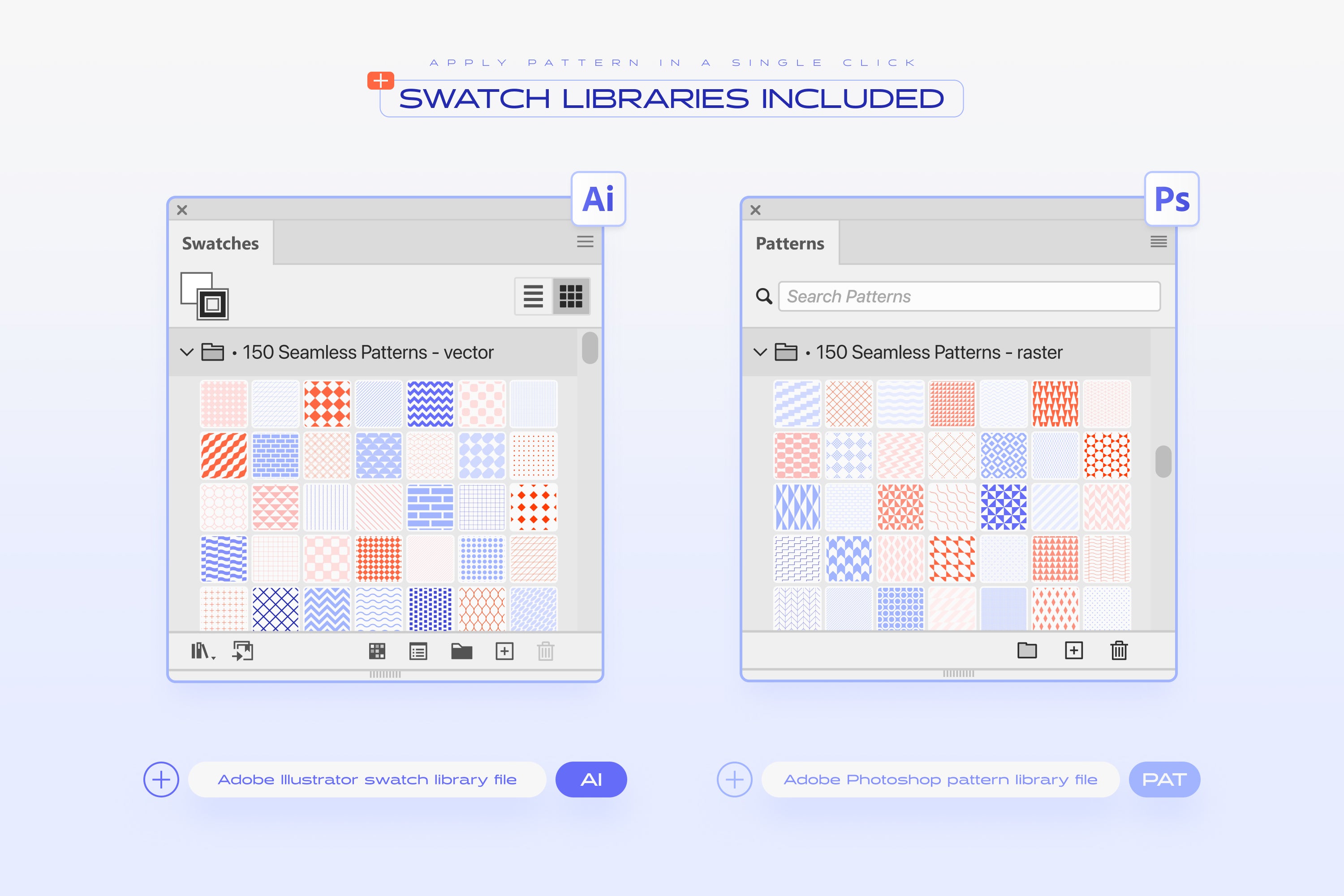 - We've included the PAT library tailored for Photoshop users, allowing you to import 300 seamless patterns (in both color and monochrome schemes) into the Patterns panel, streamlining the application of patterns in your designs.