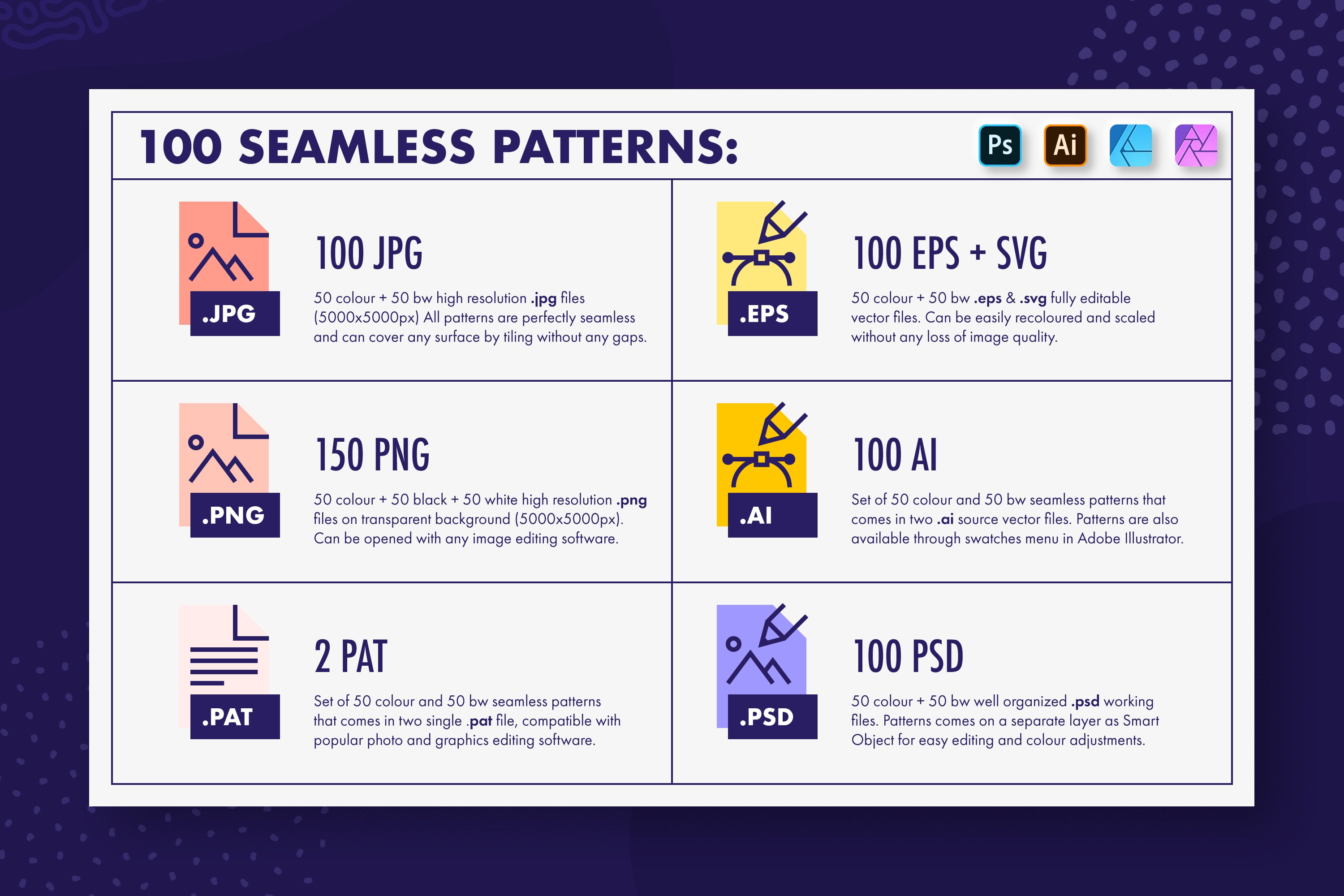 2 PAT Files: Containing 50 Color + 50 BW seamless pattern libraries, accessible through Adobe Photoshop's Patterns Panel.